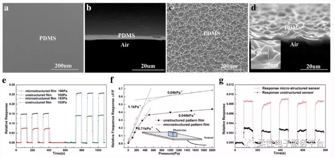 圖1a-d非結構化PDMS膜的俯視圖(a)和側視圖(b)的SEM圖像,微結構化PDMS膜的俯視圖(c)和側視圖(d)的SEM圖像。 e比較具有不同結構的傳感器的相對響應。f兩個結構化傳感器的靈敏度測試。g兩個結構化傳感器在1 Pa壓力下的響應。