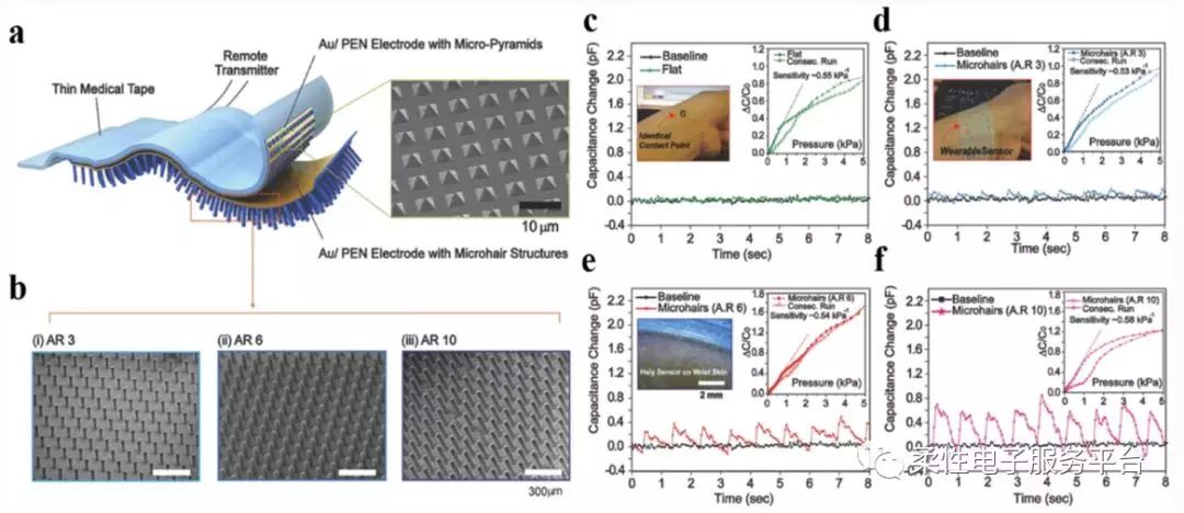可以通過微結構化電極或介電層來顯著增強電容式傳感器的傳感能力。如圖1a-d所示,Quan等人使用磨砂玻璃作為模板來制備微結構PDMS膜,作為柔性電容傳感器的電極基板。他們將帶有微結構電極的傳感器與沒有微結構電極的傳感器進行了比較。圖1e–g中的結果表明,具有微結構的傳感器具有更高的靈敏度,更低的檢測限和更快的響應時間。Kang等人開發了一種基于海綿狀多孔介電層的高性能電容式壓力傳感器。通過將PDMS涂覆在堆疊有聚合物微珠的硅基底上,然后溶解聚合物微珠,來獲得海綿狀多孔結構。然后將多孔PDMS膜轉移到ITO薄膜電極上,從而得到具有超高靈敏度和高穩定性的電容傳感器。多孔PDMS壓力傳感器的靈敏度是基于裸露PDMS膜的傳感器的靈敏度的八倍以上。微結構電容式傳感器性能更好的原因可以歸結為以下兩點。一方面,構造彈性體電極基板或介電層改善了裝置的可壓縮性。另一方面,微體系結構以有序的方式在電容器的導電板之間添加了空隙,這使得介電常數在壓力下可改變。當外力施加到傳感器上導致變形時,介電層中的氣孔總量減小,空氣/彈性體混合介電層的介電常數增大,從而由兩個原因引起的電容式傳感器的電容值上升因素:板間距的減小和介電常數的增加。此外,Pang等人開發了一種高靈敏度的壓力傳感器,該傳感器具有金字塔形的PDMS電介質層和微毛結構的界面,如圖2a,b所示。圖2c-f比較了四個具有不同界面幾何形狀的傳感器的動脈測試結果,結果表明,微毛狀界面可以明顯提高電容式壓力傳感器的信噪比。