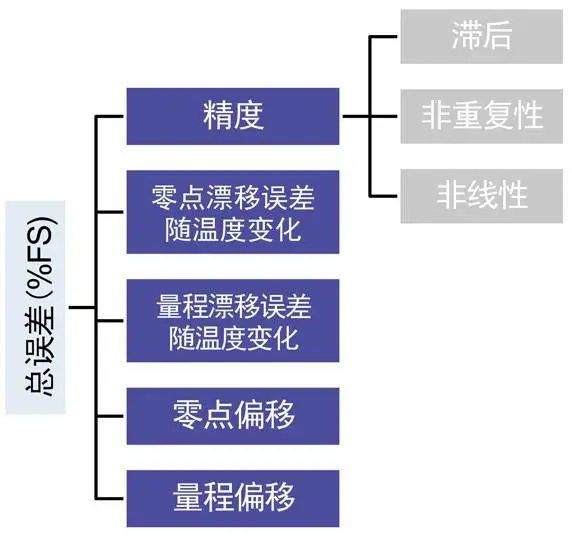另一個(gè)顯著的傳感器改進(jìn)是總誤差。由于較新的傳感器都經(jīng)過熱特性測(cè)量,它們被更好地?zé)嵫a(bǔ)償,這可提高總誤差帶。總誤差帶通常包括零點(diǎn)和量程偏移的最大不確定性誤差、零點(diǎn)和量程漂移、滯后、非線性和非重復(fù)性(見圖8)。